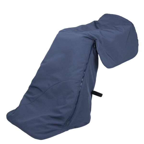 An der Vorderseite befindet sich eine Decke, die großzügig über die Oberschenkel fällt und einfach an der Seite verstaut werden kann. Dadurch lässt sich der Beinschutz gut mit unserem Rollstuhlcape kombinieren, das ordentlich über den Beinschutz fällt.